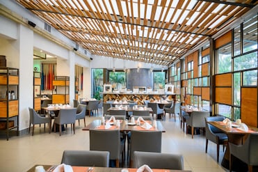 Marvel at the garden's beauty, then savor a refined meal at the poolside restaurant of this luxury hotel. A serene paradise awaits.