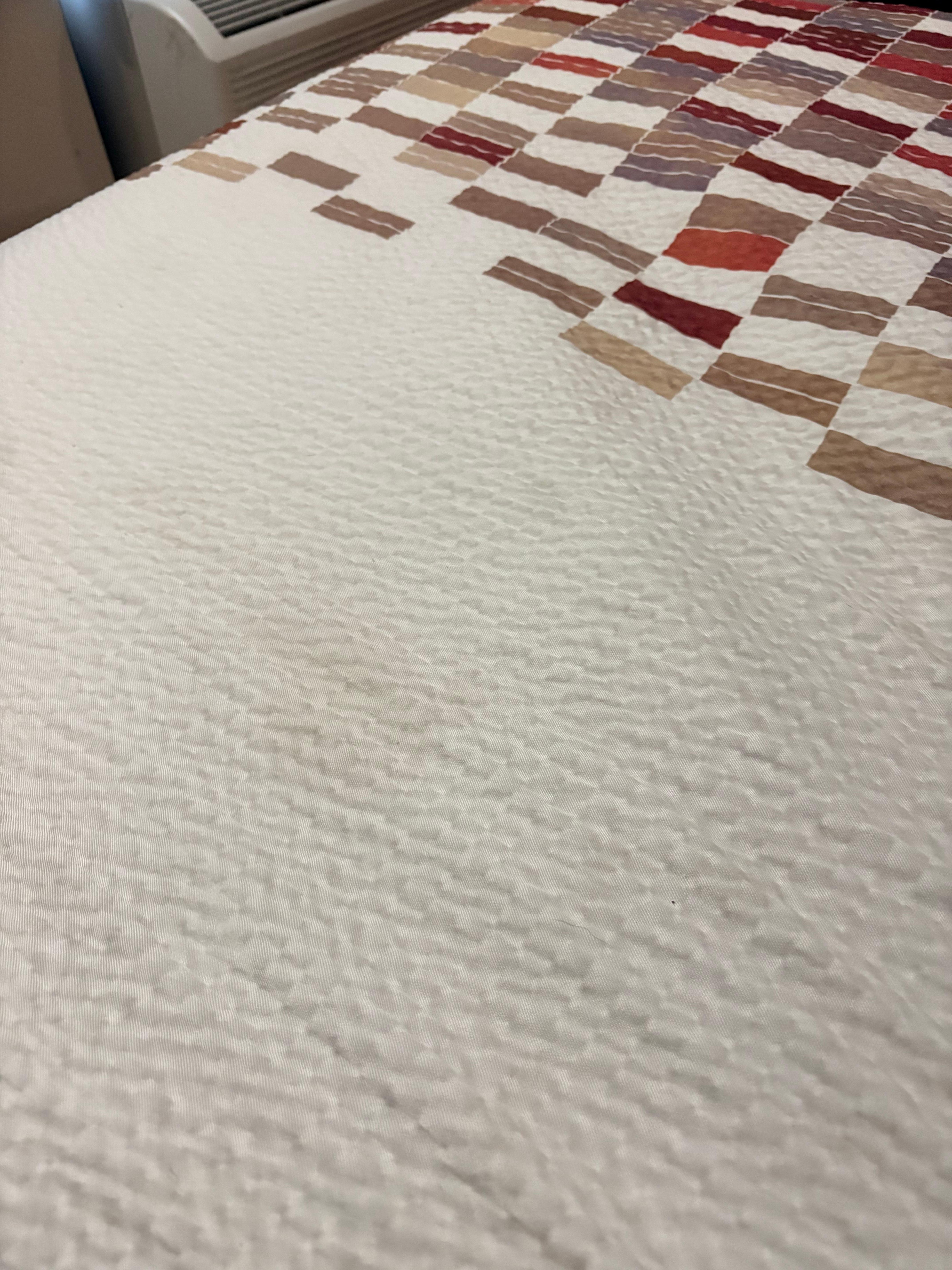 Supposedly they had just cleaned the room. The floor was gritty. There were stains on the bedding and the mattresses. The smoke detector was hanging off the ceiling. The bathroom looked like it was in the middle of renovation and the shower was leaking and discolored. There were stains on the curtains. One of the outlet covers wasn’t even attached to the wall.